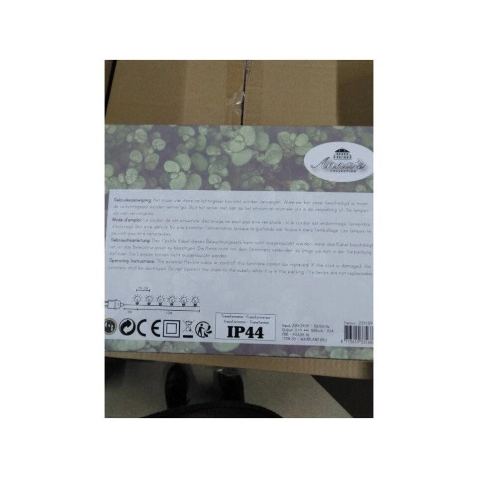 Soort verlichting: LED. Kleur licht: multi color. Kleur snoer: zwart. Totale lengte lichtsnoer: 15 meter. Lengte snoer met lampjes: 10 meter. Aantal lampjes: 20. Lengte aanloopsnoer: 5 meter. Formaat per lampje: diameter 5 cm. IP44 spatwaterdicht. Aansluiten op een geaard stopcontact wordt aangeraden.
