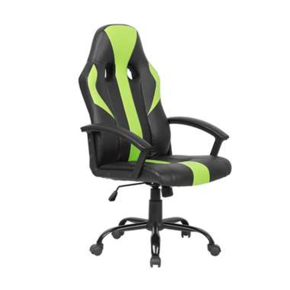 Bureaustoel in zwart en groen kunstleer. Geniet van totaal zitcomfort tijdens werk of vrije tijd, dankzij deze volledig verstelbare stoel. Het meubel heeft een stevig metalen onderstel, voorzien van vijf nylon wielen. Het geïntegreerde gaslift- en draaimechanisme zorgt voor een soepele hoogteverstelling en volledige stoelrotatie. Het hypermoderne ontwerp en de kleurstelling van de stoel passen perfect in interieurs met een moderne en hedendaagse inrichting.