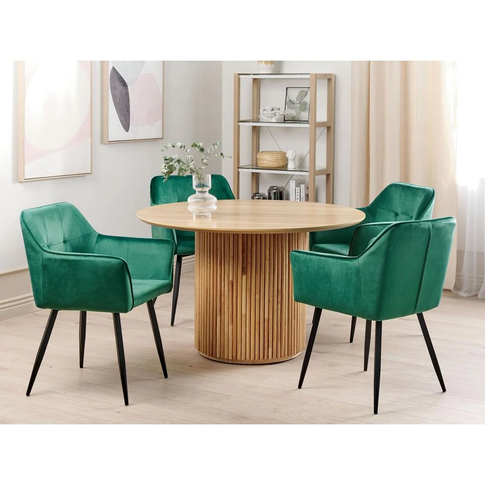 Eetkamerstoel met metalen poten en fluwelen hoes in set van 2. Het minimalistische en tegelijkertijd luxueuze ontwerp van deze stoelen maakt indruk met een tijdloze uitstraling. De strakke lijnen van de stoelen worden geaccentueerd door de fluwelen bekleding. De textuur en de kleur brengen elke kamer tot leven. Afgerond met slanke metalen poten past de stoel perfect bij elke inrichtingsstijl.