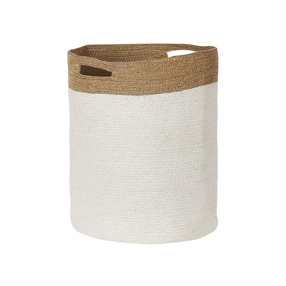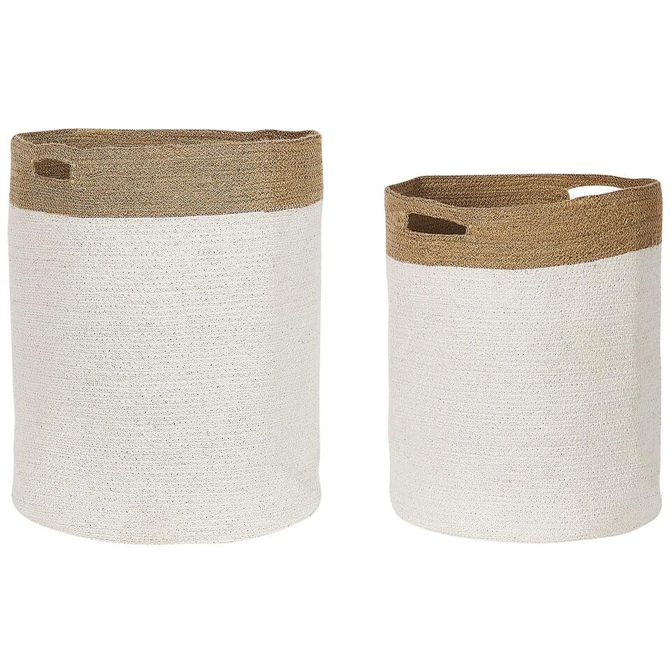 Set van 2 gevlochten opberg manden. Organiseer je ruimte met deze twee stoffen manden. Gemaakt van jute en katoen, beide sterke en natuurlijke materialen die de manden stevig maken waardoor je er verschillende spullen in kan opbergen, van dekens tot tijdschriften en boeken. Dankzij het ontwerp en de combinatie met natuurlijke kleuren passen de manden bij elk interieur en voegen ze een boho accent toe.