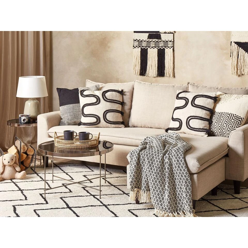 Elegant deken met franjes. Dit katoenen deken is een belangrijk onderdeel voor elk modern interieur. Met een wit en zwart geometrisch patroon met franjes straalt het elegantie en eenvoud uit. Combineer de plaid met andere accessoires in getinte kleuren om een gezellige, maar stijlvolle ruimte te creëren.