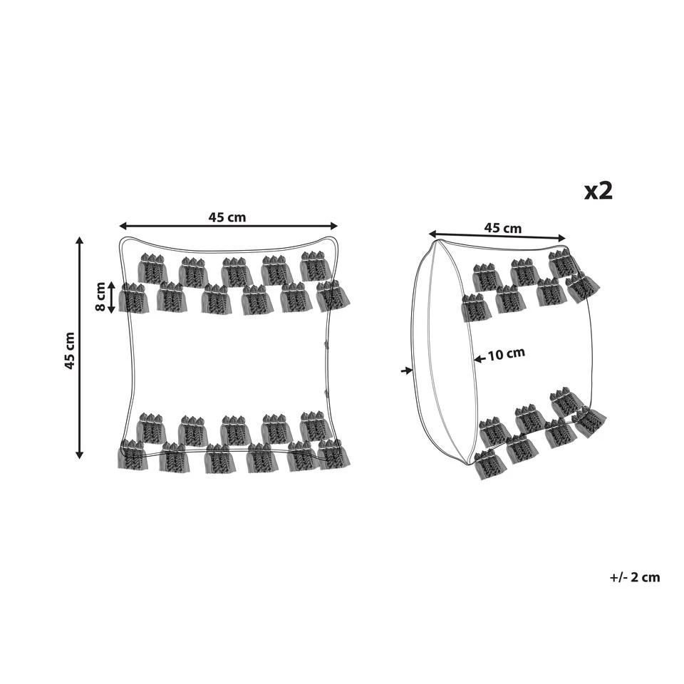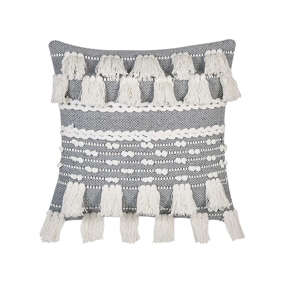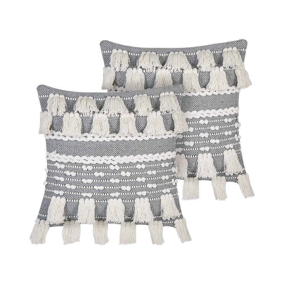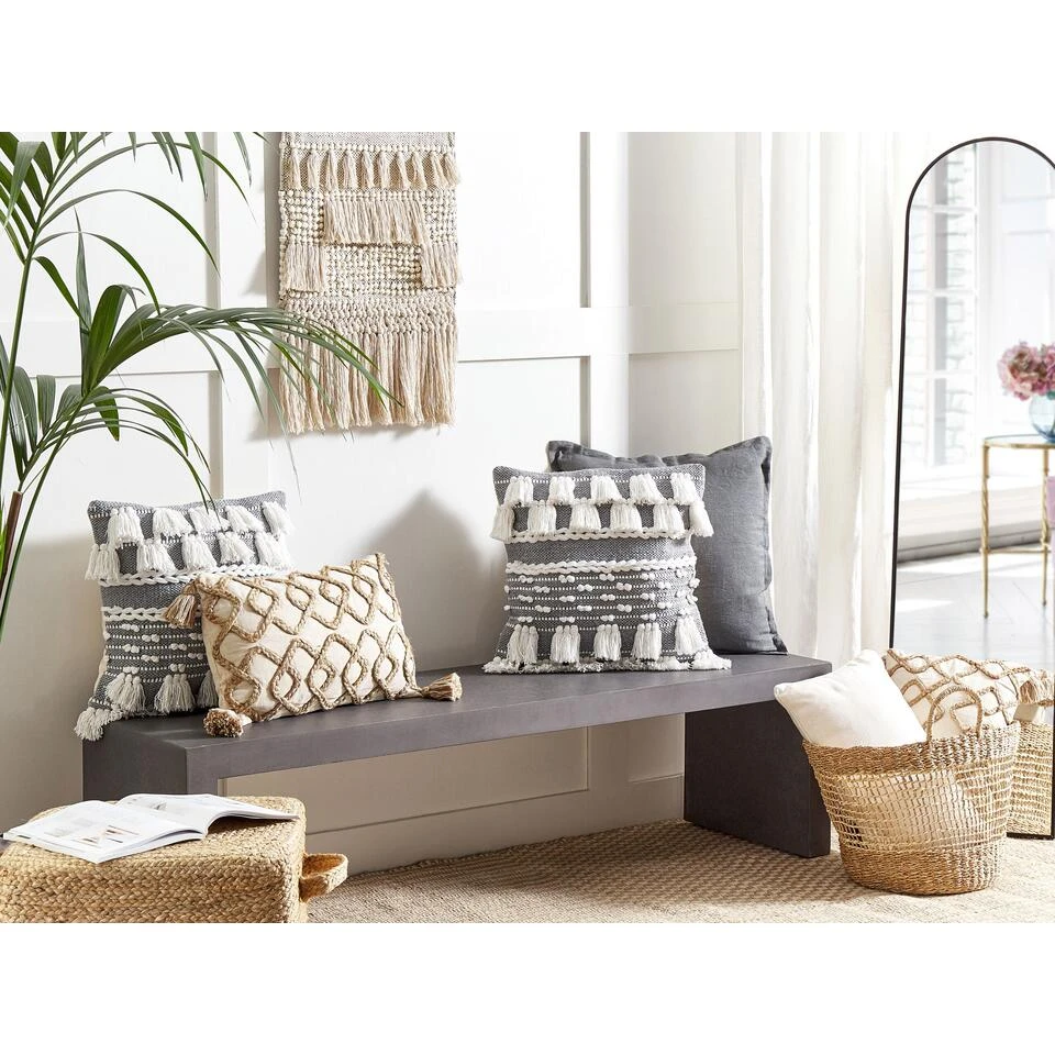 Boho sierkussens met kwastjes. Deze zeer decoratieve kussens helpen je om zonder veel moeite de look van je interieur te veranderen. Ze hebben decoratieve kwastjes, een katoenen vlecht in het midden en minibolletjes. De sneeuwwitte kleur in combinatie met grijs zorgt voor een stijlvol en bijpassend contrast dat zeker ieders aandacht zal trekken. De hoezen zijn volledig gemaakt van katoen, waardoor de kussens bijzonder zacht en comfortabel zijn.