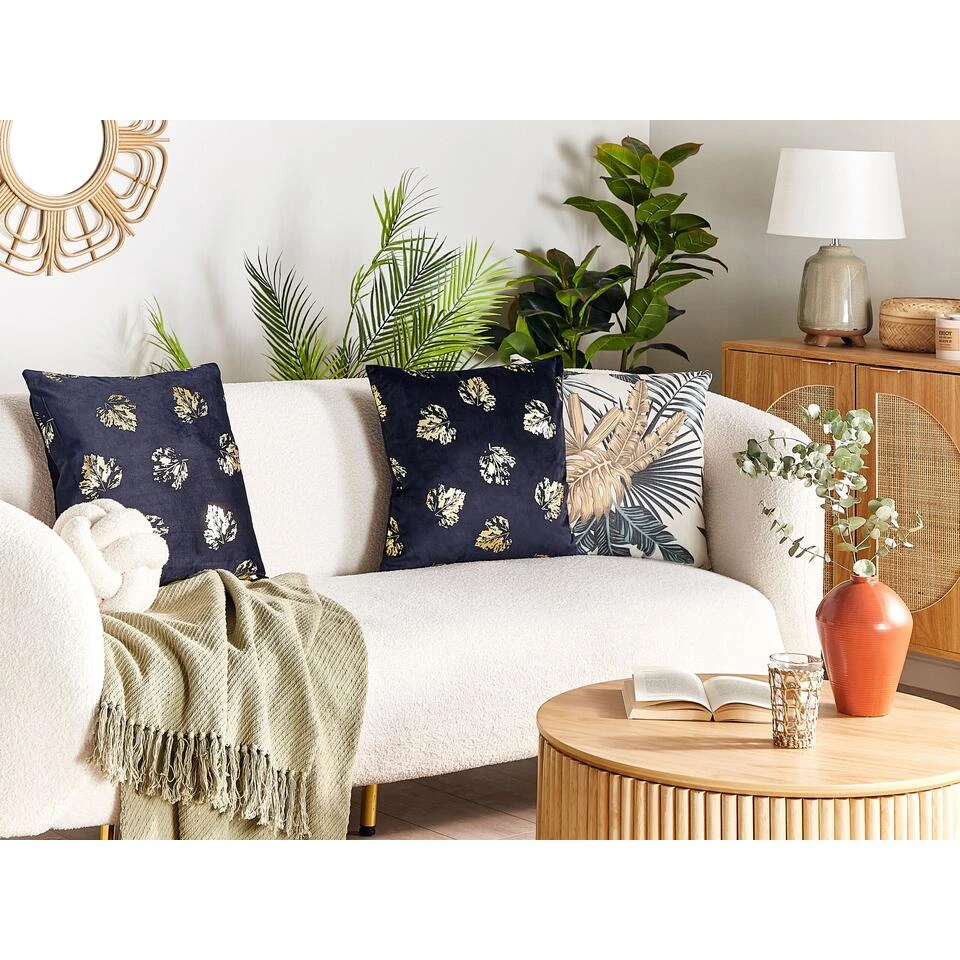 Glamour kussens met bladerprint. Deze kussens zijn een echt stijlvol accessoire. Elegante kussenhoezen in zwarte kleur gecombineerd met gouden bladeren print brengen een glamour accent in het interieur, waardoor het er net wat chiquer uitziet. Naast een mooi design zijn de kussens dik gevuld, dus perfect voor een middagdutje.