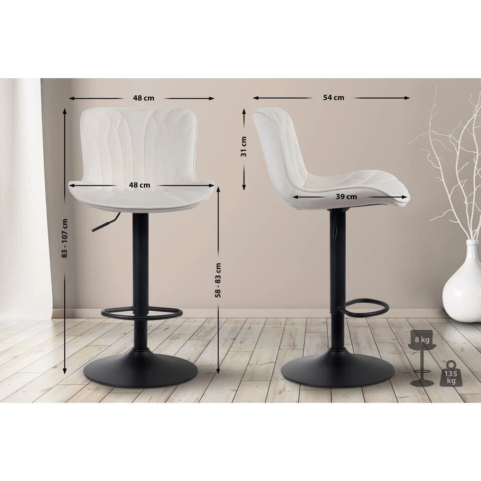 Deze barkruk is verkrijgbaar met drie verschillende robuuste en onderhoudsvriendelijke bekledingen: u kunt kiezen uit stof, fluweel of kunstleer. Gevoelige vloeren worden niet beschadigd door het metalen frame, want het is voorbereid met vloerbeschermers.