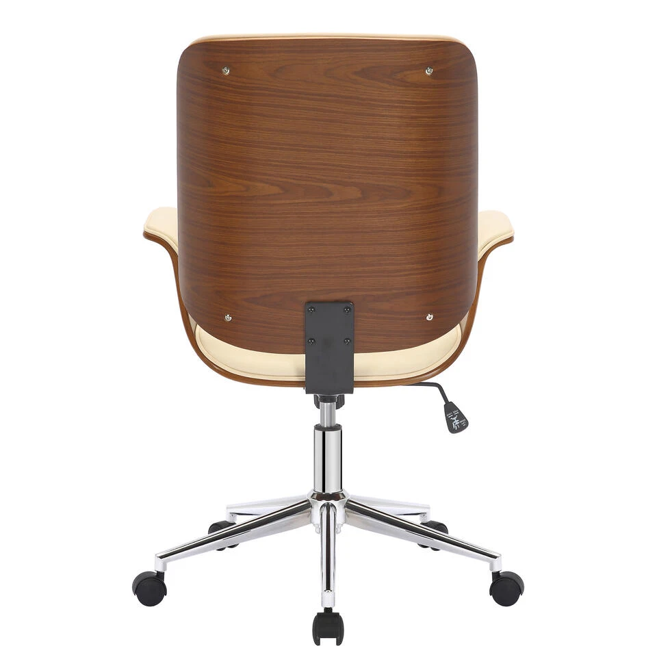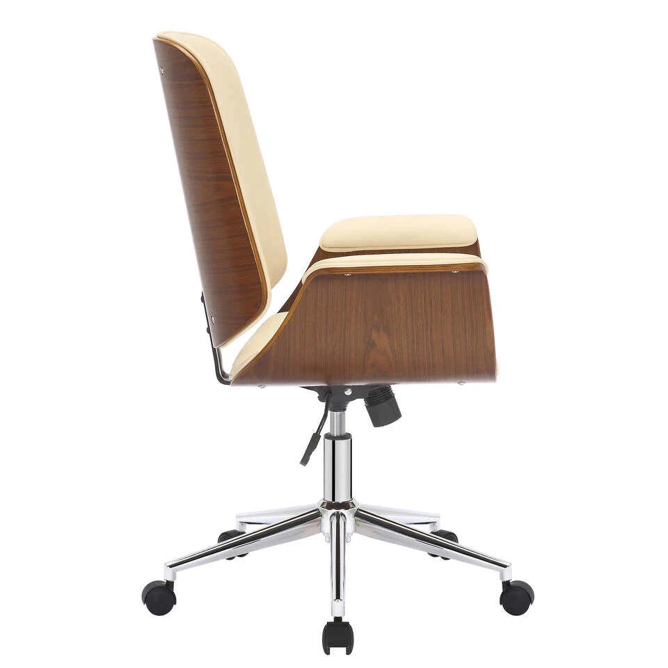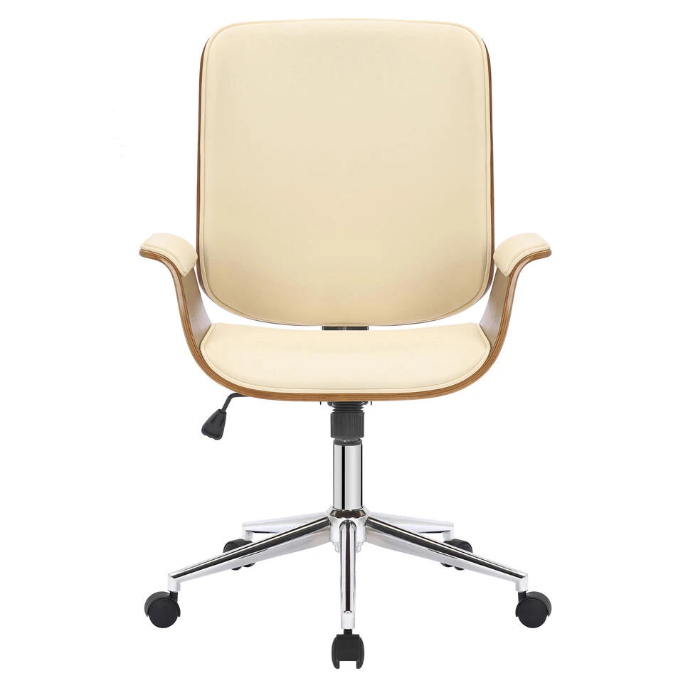 De Mick bureaustoel is een stijlvolle bureaustoel met een hoogwaardige stoffering en een bekleding van kunstleer. De zitting van gebogen hout maakt van deze bureaustoel een absolute blikvanger en geeft hem een edele vormgeving. Dankzij de traploos instelbare zithoogte is ergonomisch zitten gegarandeerd en het ingebouwde schommelmechanisme zorgt voor meer bewegingsvrijheid. Het elegante verchroomde frame en de stevig gebogen armleuningen geven het geheel iets extra’s en ronden het ontwerp af. De bureaustoel staat stevig op vijf lichtlopende wieltjes. Het maakt niet uit of het een harde vloer of een tapijtvloer is – u kunt altijd gemakkelijk en losjes over de vloer rollen.