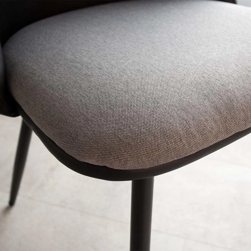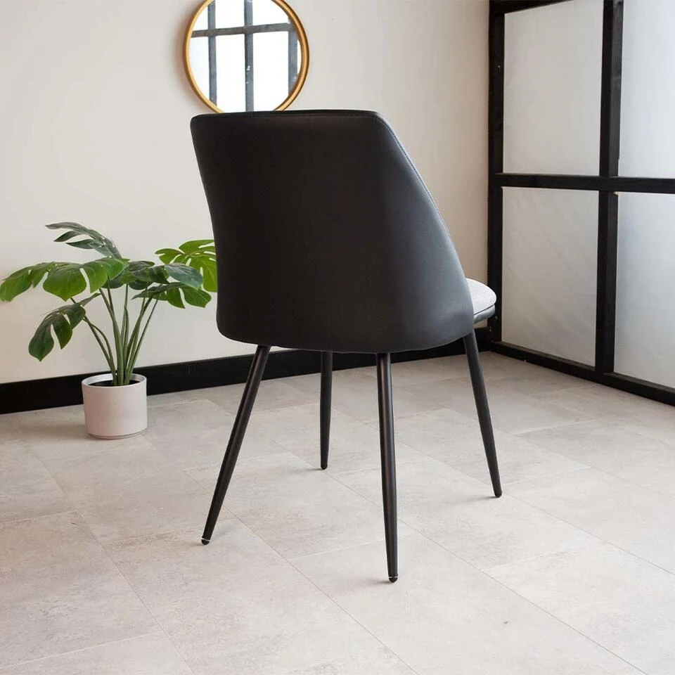 Deze eetkamerstoel staat op een metalen, zwart gepoedercoat frame. Onder dit product zitten vloerdoppen die laminaat beschermen tegen krassen. Er worden viltjes meegeleverd om overige vloeren te beschermen tegen krasvorming.