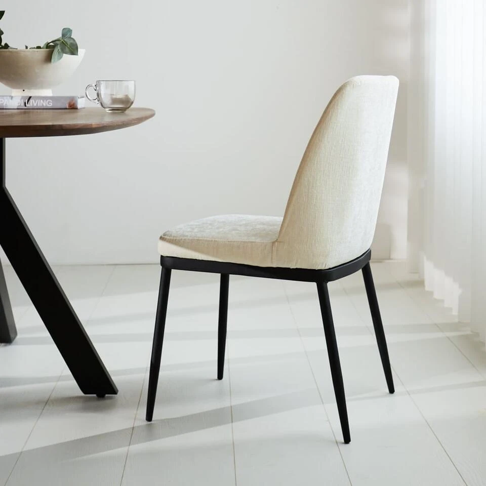 Een zachte, aaibare stoel met een lichte glans, dat is eetkamerstoel Noli. De eetkamerstoel is bekleed met een trendy en zachte chenille stof. Chenille wordt gemaakt van chenille garen die bestaan uit polyester. De stof krijgt een chique uitstraling door de glans. Chenille stof lijkt door de glans op fluweel. Daarnaast is chenille extreem slijtvast en gemakkelijk in onderhoud. Perfect voor een een eetkamerstoel dus. Noli is niet alleen stijlvol maar heeft ook een hoog zitcomfort. Dit komt met name door de hoge rugleuning en de zachte stof. Lekker lang tafelen is met deze stijlvolle eetkamerstoel Noli geen straf.