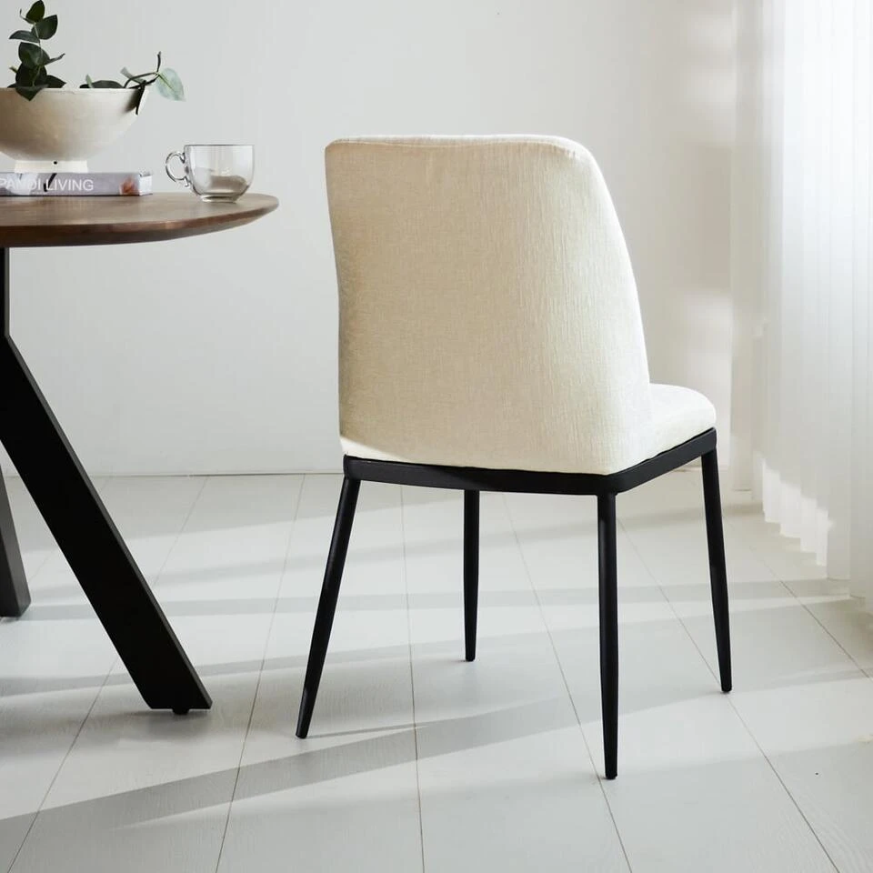 Deze eetkamerstoel staat op metalen, zwart gepoedercoat frame. Onder de poten zitten vloerdoppen die laminaat beschermen tegen krassen. Voor tegels adviseren wij om viltjes onder de doppen te bevestigen.