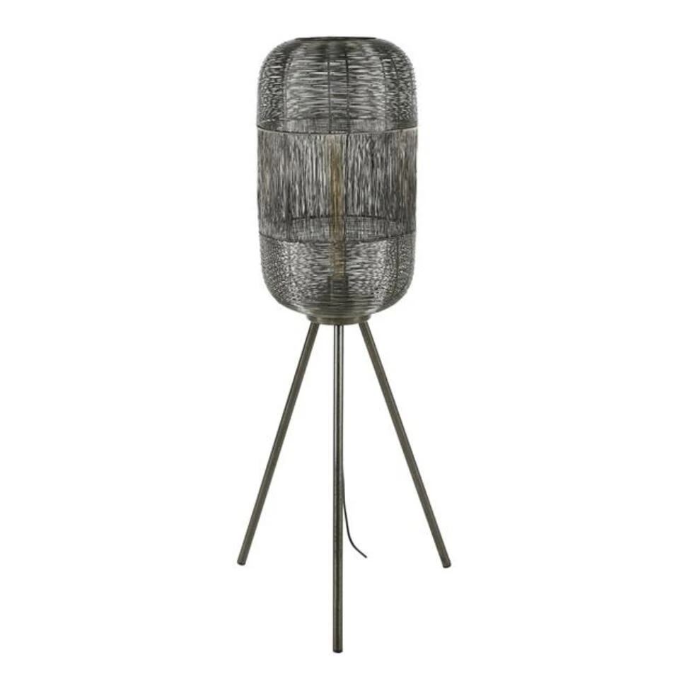 De lampenkap is gemaakt van zwart metaal in een geweven patroon. Op de lampenkap zitten aan de boven- en onderkant lichte soldeerplekjes. De lampenkap heeft een diameter van 30cm en een hoogte van 52cm. Vloerlamp Floor heeft een zwart metalen driepoot. De totale hoogte van de lamp is 108cm.