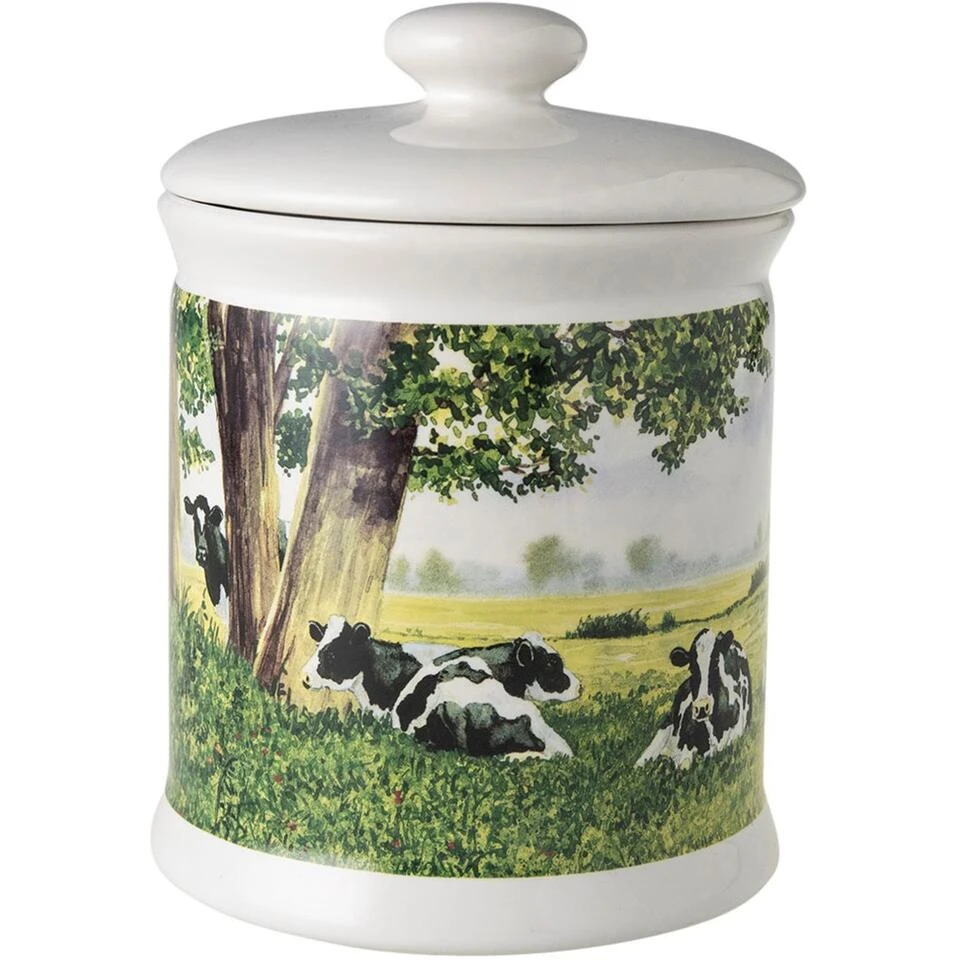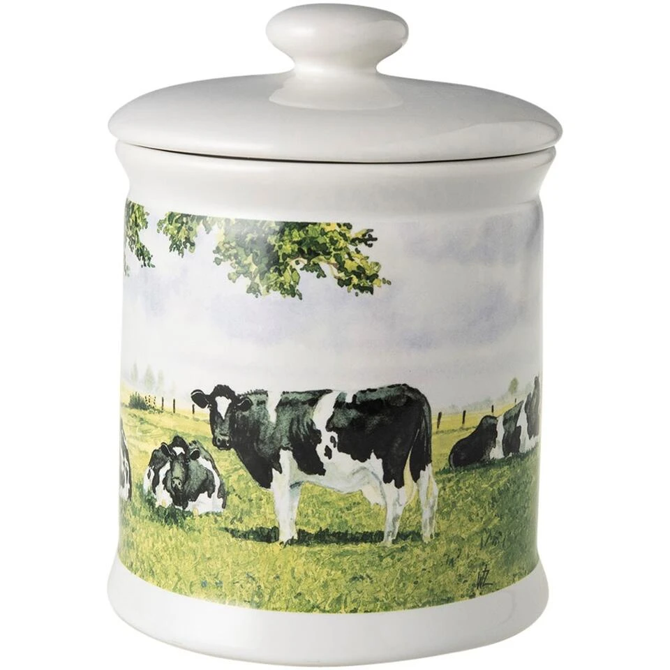 Deze porseleinen voorraadpot met Hollandse koeien vrolijkt je keuken helemaal op. Handig voor het bewaren van meel, pasta of koekjes. Zet lsquom op het aanrecht, in een open keukenkast of zet de pot op de tafel in de woonkamer. Zo heb je altijd een gezellig tafereel in het zicht